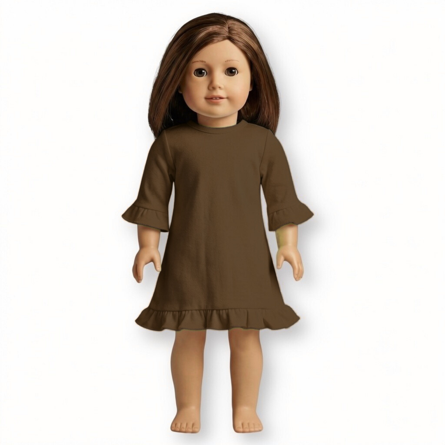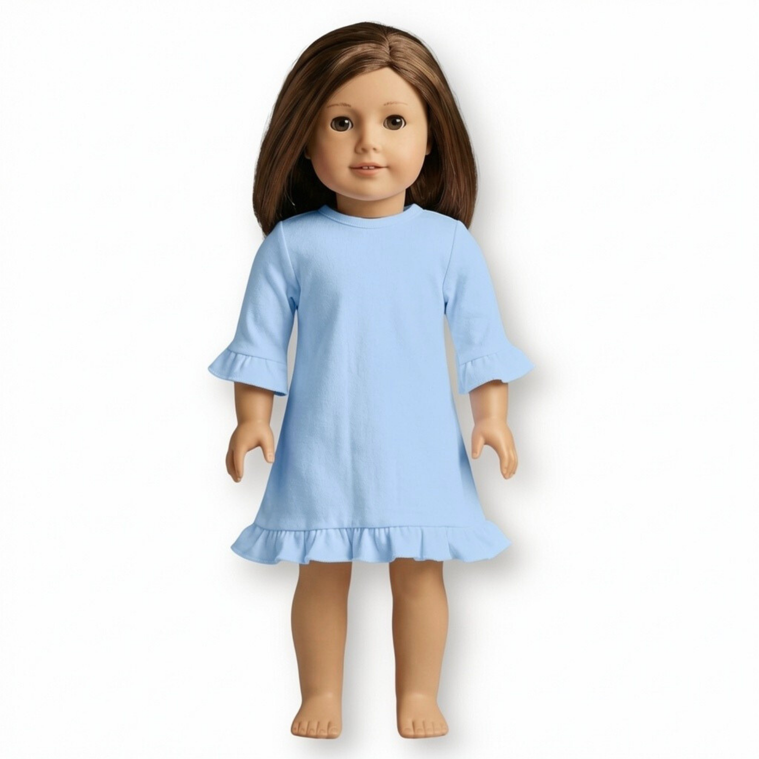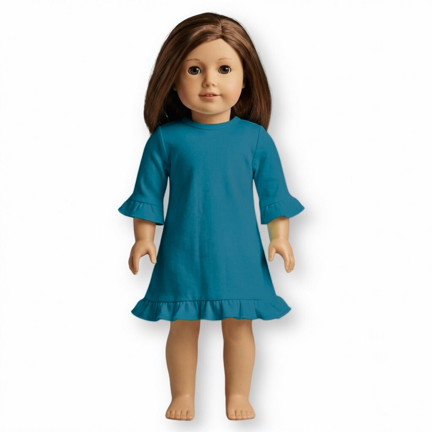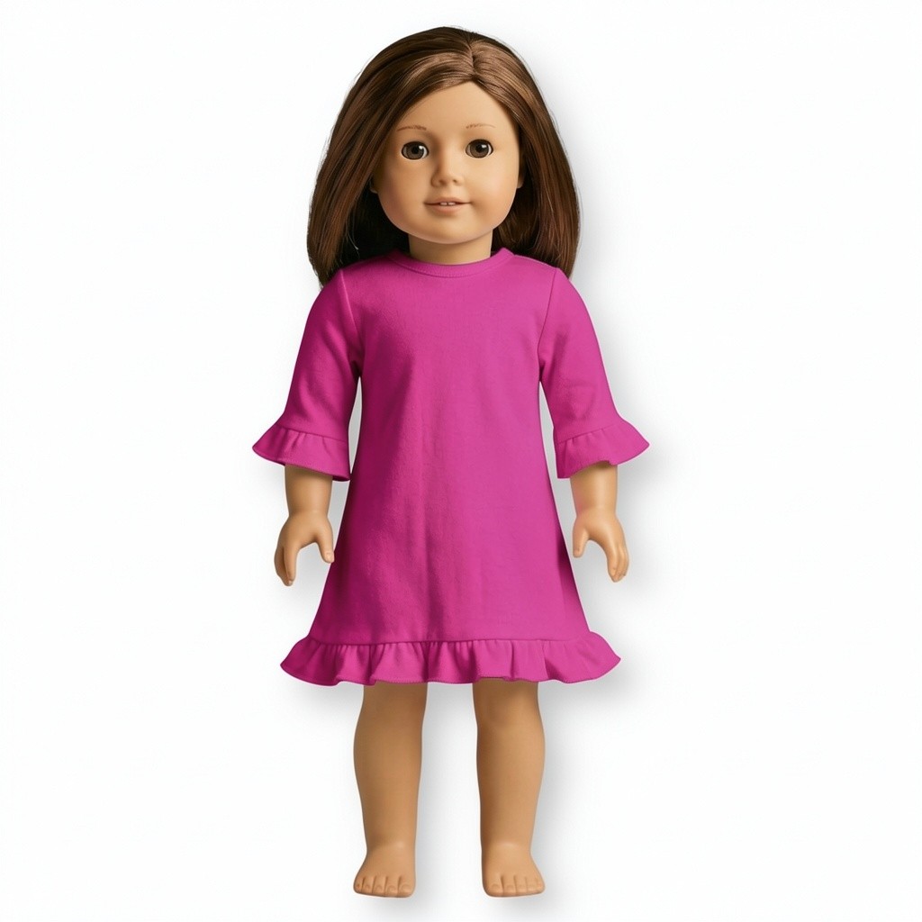 Our long sleeved ruffled doll dresses fit 18 inch dolls and velcro open in the back to make embellishment easy!