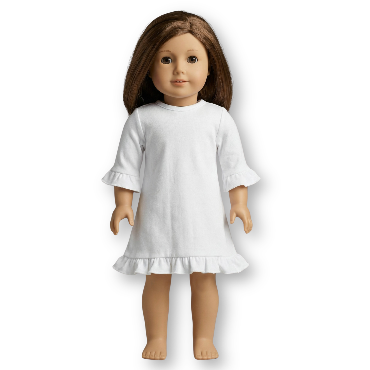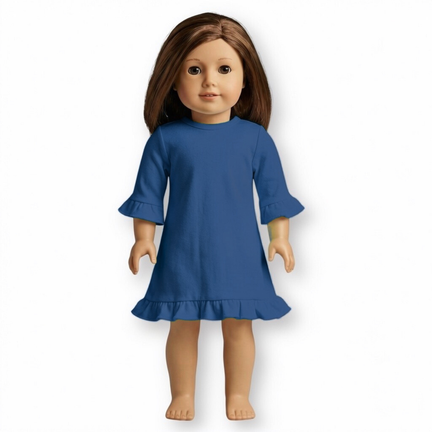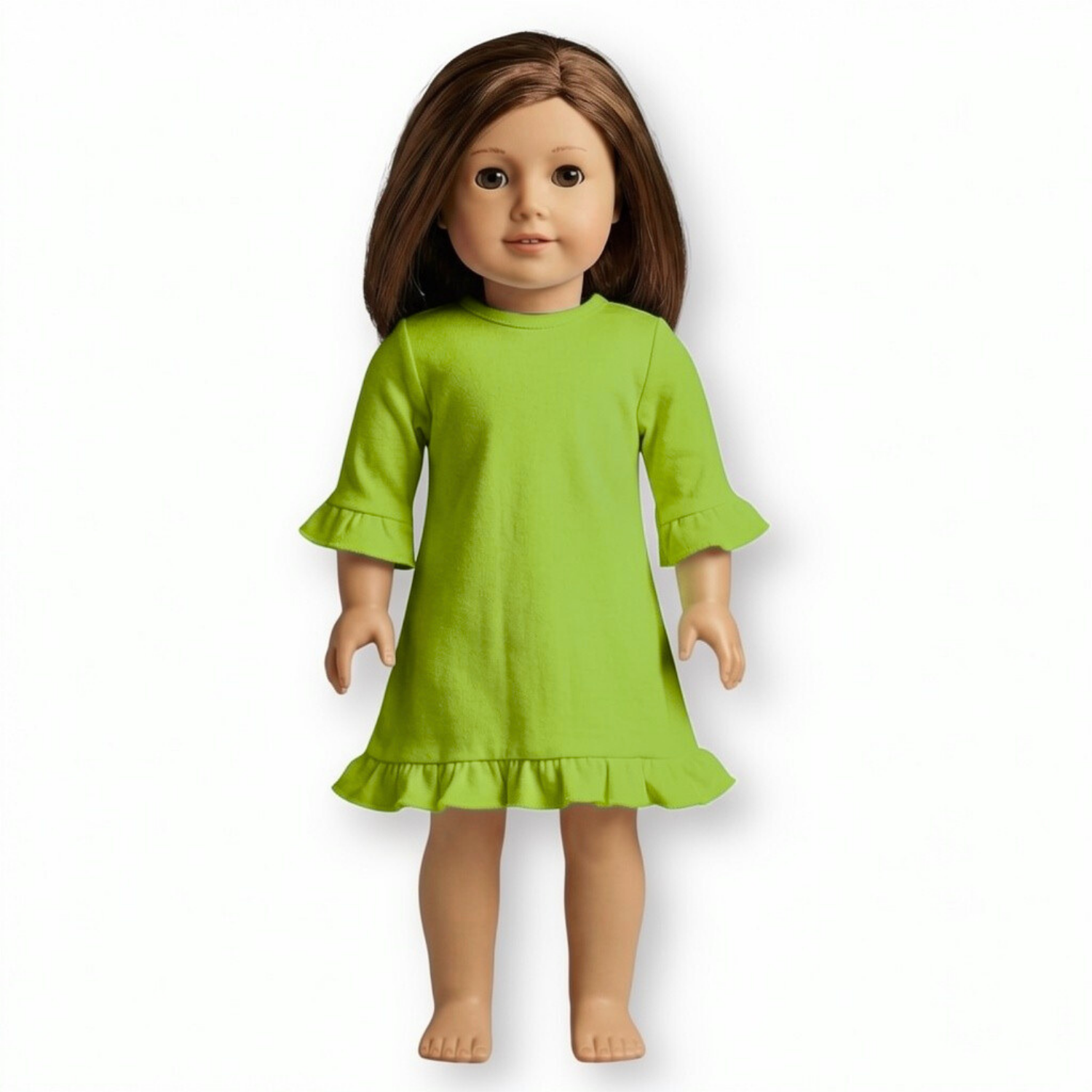 Our long sleeved ruffled doll dresses fit 18 inch dolls and velcro open in the back to make embellishment easy!